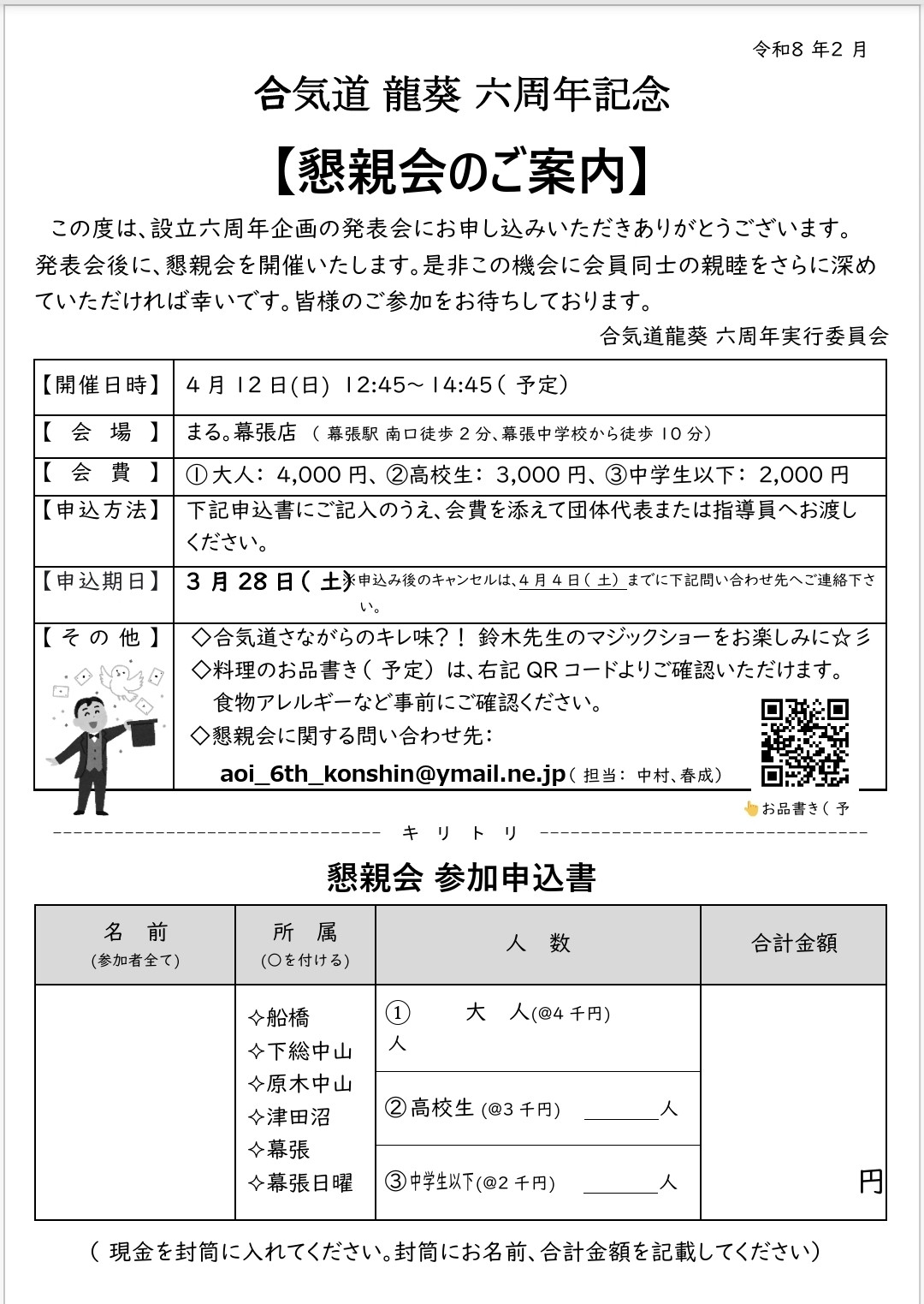 ◎龍葵設立6周年を迎えるにあたり、初の試みである合気道発表会を開催できますことを大変嬉しく思っております。発表会当日も含め、精一杯楽しみましょう。鈴木